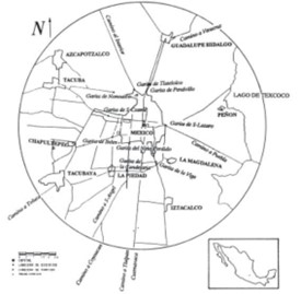 De la misma forma la Ciudad de México tenía como límites al sur la calle de Dr. Liceaga con dos prolongaciones a lo largo del Viaducto Tlalpan y de la Calzada de la Viga, al oeste la calle de Bucareli y una prolongación de ambos lados del camino a Tacuba hasta el Circuito Interior, al norte la Plaza de las Tres Culturas y la Glorieta de Peralvillo, y al este el Palacio Legislativo de San Lázaro. Existían diferentes poblados separados entre sí por áreas verdes, pantanos y tierras agrícolas: Iztacalco, La Piedad, Tacubaya, Chapultepec, Tacuba, Azcapotzalco y Villa de Guadalupe (Martínez Flores y Valadez Tapia, 2012:65-66).[6]
