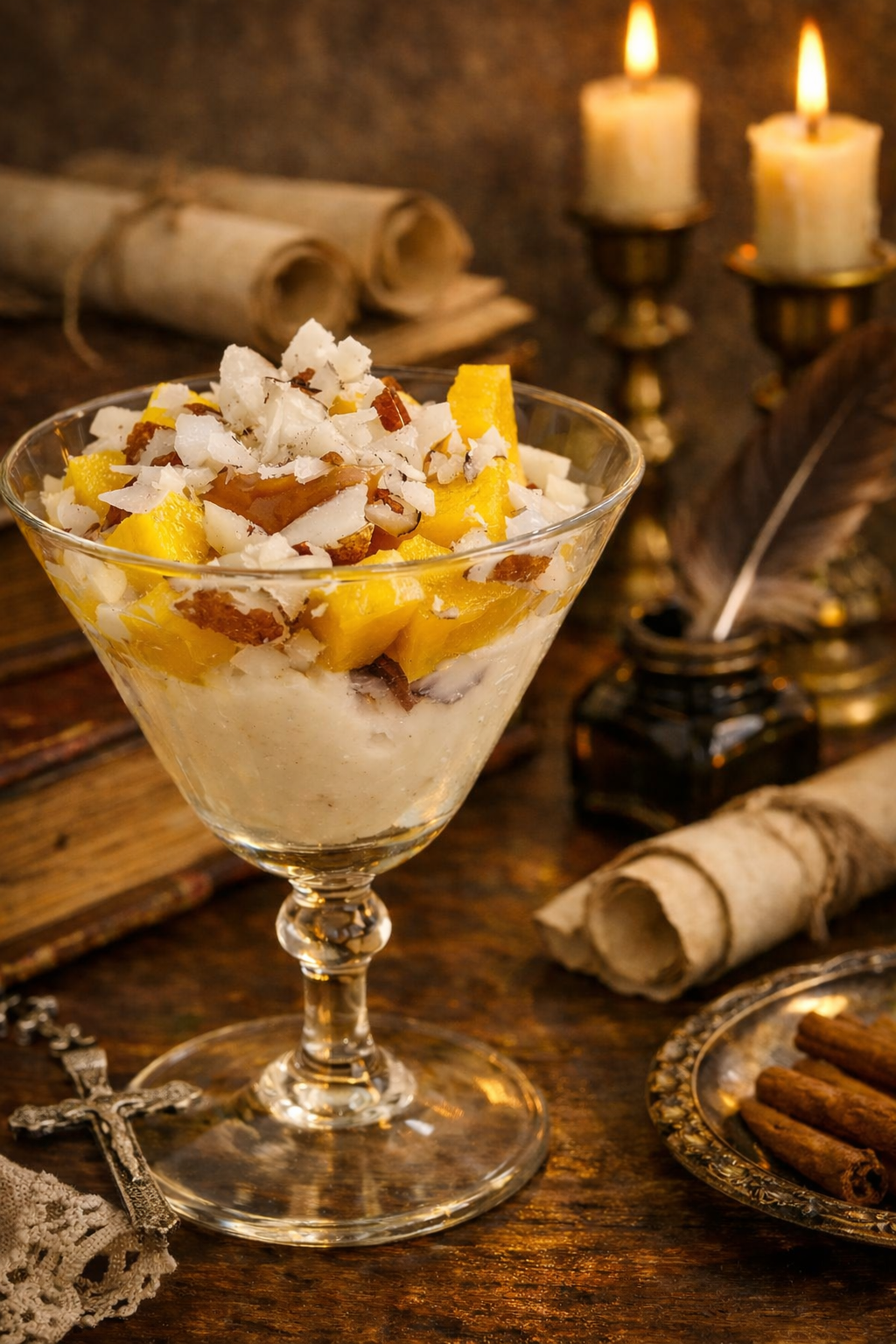 En una copa disponga una capa de crema de arroz que se consigue licuando en un litro de leche, una taza de arroz previamente remojado en agua. Lleve a cocción lenta, añada tres cuartos de taza de azúcar. Incorpore lentamente ocho yemas batidas aparte, revuelva sin parar para evitar que cuaje. Perfume con un poco agua de azahar. Refrigere por cuatro horas antes de servir.